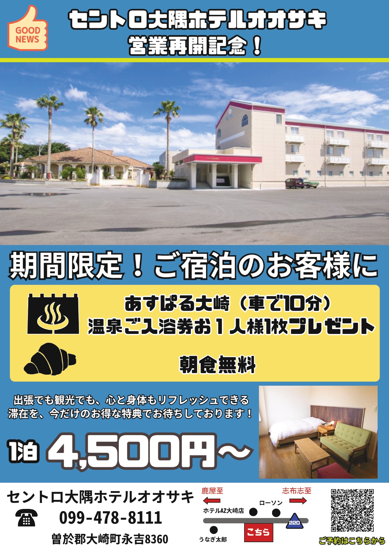 10月より営業再開記念!期間限定 お得な近隣温泉券付+無料朝食プラン 販売中!